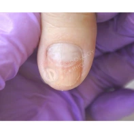 Симптомами псориаза ногтей могут быть точечные углубления, белые пятна и точки, красные точки на лунке, крошащиеся ногти, а также отслоение, утолщение ногтевой пластины с рыхлыми подногтевыми массами и продольные кровоизлияния под ногтевой пластиной.