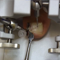- Пораженный палец помещают в специальный аппарат, в котором есть деталь, надавливающая на центр ногтевой пластины, и составляющие, приподнимающие ее боковые края.