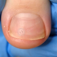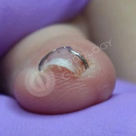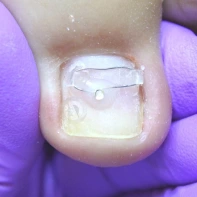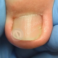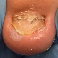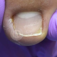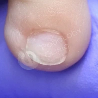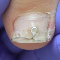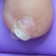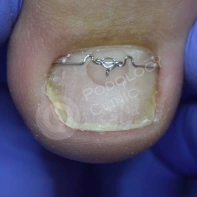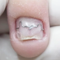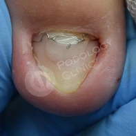В данном случае необходима чистка ногтевой пластины и установка коррекционных систем. Иногда подолог может установить тампонады или протезирующий материал для поднятия ногтевой пластины над ложем. Все зависит от клинической картины и выраженности закрытия ложе дистальным валиком. Данные манипуляции проводятся 1 раз в 2-4 недели, сроки так же зависит он выраженности клинической картины.