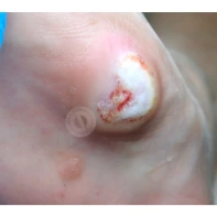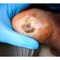 Язвенные дефекты на пальцах ступней часто возникают у пациентов с сахарным диабетом и нейропатией. Они могут появляться в межпальцевых промежутках или на кончиках пальцев. Эти язвы особенно опасны из-за высокого риска инфицирования и развития остеомиелита. Своевременное выявление и лечение таких язв критически важно для предотвращения ампутации.